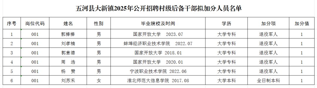根据《五河县大新镇2025年关于公开招聘村级后备干部的公告》,属退役军人身份的、全日制本科及以上学历的按公告要求进行加分。经加分资格审核、汇总确认等程序,现对报考了大新镇村级后备干部岗位且符合加分条件的人员予以公示。对公示无异议且参加了面试的考生,按相关规定落实加分事宜。