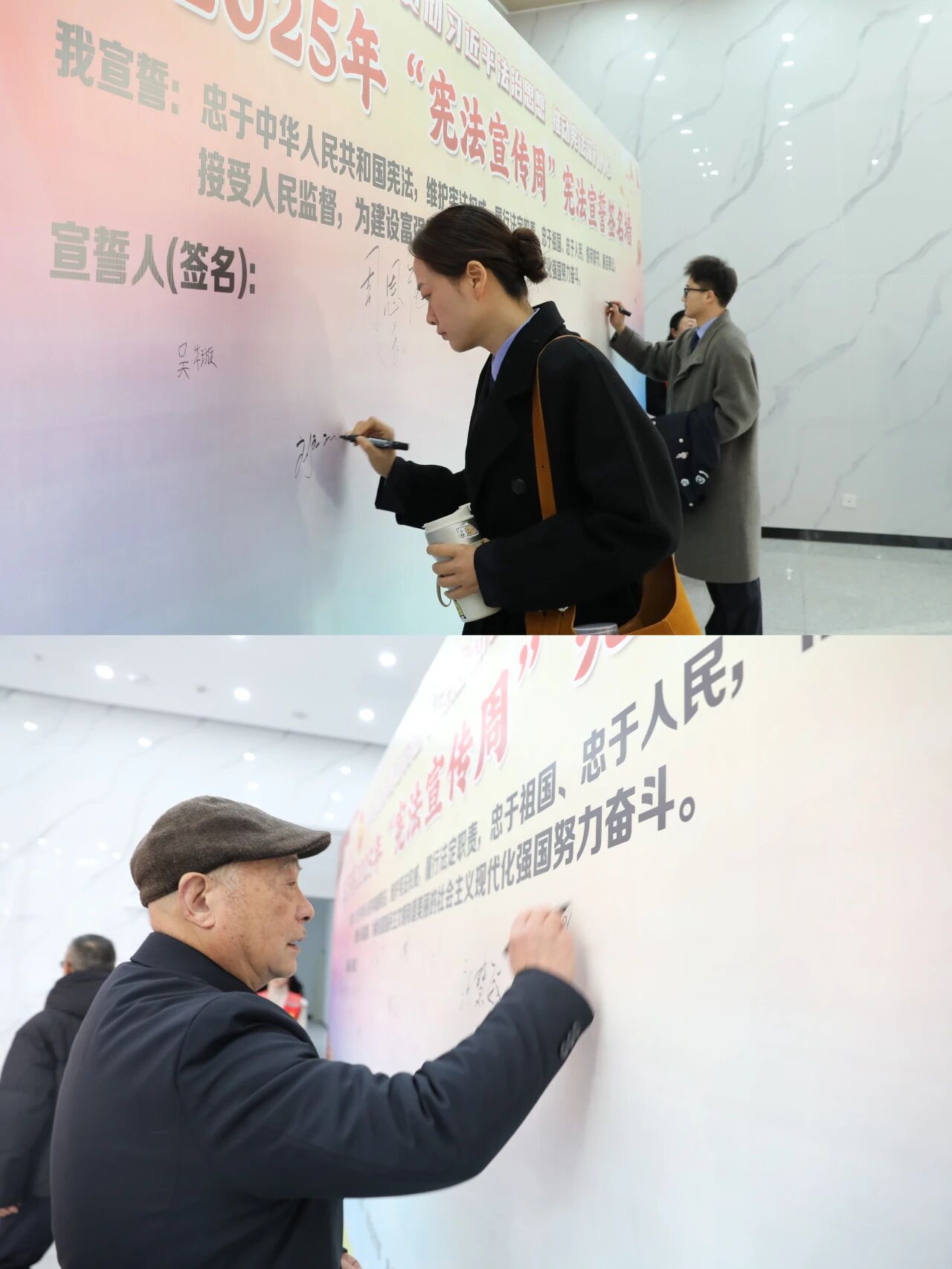 在全民普法40年来宪法学习宣传成效和经验集中展示区吸引众人驻足观看,讲解员在展板前耐心咨询答惑;宪法宣誓签名墙前人头攒动,宣誓签名“宪”场拍照打卡;法治大屏滚动播放全县“八五”普法成果展视频;虹城普法志愿者在流动的人群中穿梭发放法治大礼包。